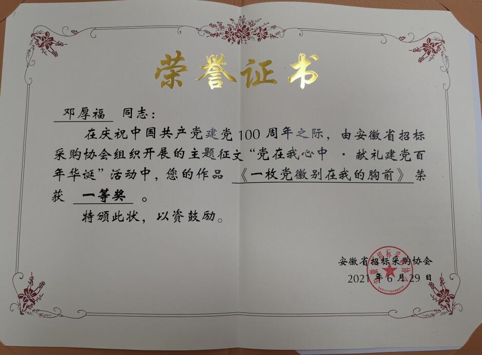 6月29日上午,由安徽省招标投标协会(以下简称:省招协)主办的“党在我心中,献礼建党百年华诞”主题征文比赛颁奖仪式在合肥隆重举办,产权党支部邓厚福凭借《一枚党徽别在我的胸前》从71篇参赛作品中脱颖而出,获得征文比赛一等奖;产权党支部吕丽莉报送的《百年向党巾帼心,砥砺奋进建新功》荣获征文比赛优秀奖。