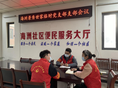 特殊时期需要共产党员的坚守,也需要全社会形成战役合力,共克时艰。在海洲社区志愿者队伍里,已组建成立“海洲景秀世家临时党支部”,由陶淑敏同志担任临时党支部书记。通过组织党员志愿者们重温入党誓词、学习最新疫情防控政策要求、沟通工作方法思路等举措,陶淑敏同志带领其余志愿者充分发挥临时党支部在抗疫工作中的战斗堡垒作用。党员冲锋带头,党旗在防疫一线高高飘摇,也动员和鼓舞了更多的居民志愿者参与到抗击疫情的工作中,目前海洲社区已累计共有十余名居民志愿者参与到此次疫情防控的卡点服务,临时党支部的凝聚力和战斗力凸显。
