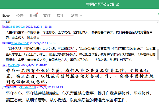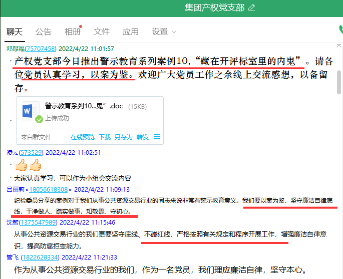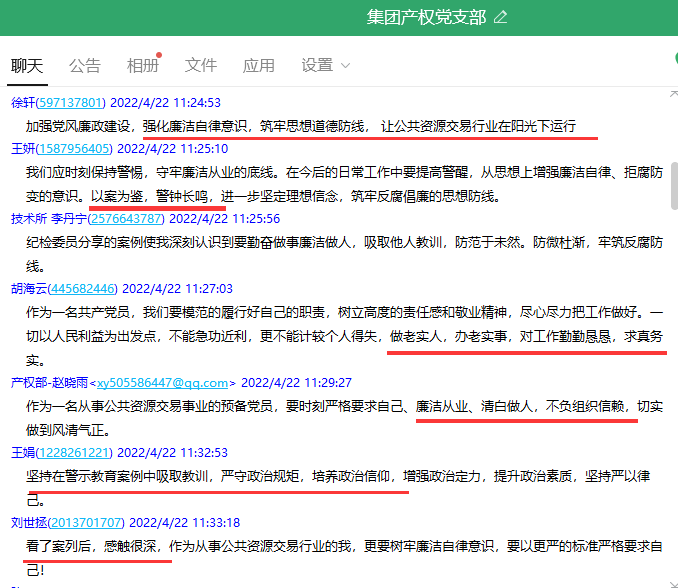 这是产权党支部近期在开展警示教育系列案例《藏在开评标室里的内鬼》学习时,部分党员同志在支部工作群里留下的心得体会。