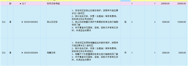 5、老校区地雕迁移、安装:清单按一项列入室外景观-园建工程分部分项工程量清单中,投标人综合考虑报价,中标后不予调整。工作内容:地雕拆除、迁移、铺设(含基础)等所有费用。