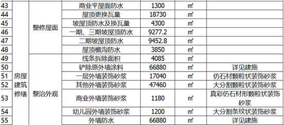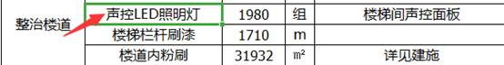 4、安装工程:包含楼梯间照明工程、路灯工程、智能化工程、充电桩管道预埋、弱电线路整理、楼道内表箱洁化、电梯按钮更换、雨水管改造、完善消防设备等;