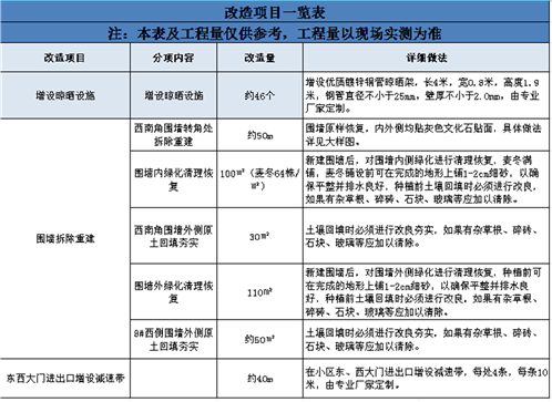 1、建筑工程:包含拆除部分、成品岗亭、铺装工程、机动车与非机动车停车位、小区道路硬化、小品警示牌、院墙外立面改造、屋面防水修复、楼道粉刷及栏杆喷漆、楼梯走道墙面、楼栋单元户号牌、围墙、单元进户门、各类管线整理、已建各类检查井升降、加固及井盖座更换、水电接引等,具体详见设计图纸、招标文件及本招标文件补遗;