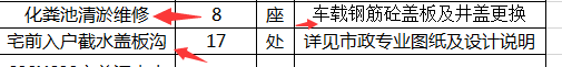 答:单座化粪池清淤量按50立方米计,维修工程为按化粪池顶面无覆土可通车的钢筋砼盖板进行更换,做法参见国标图集03S702。