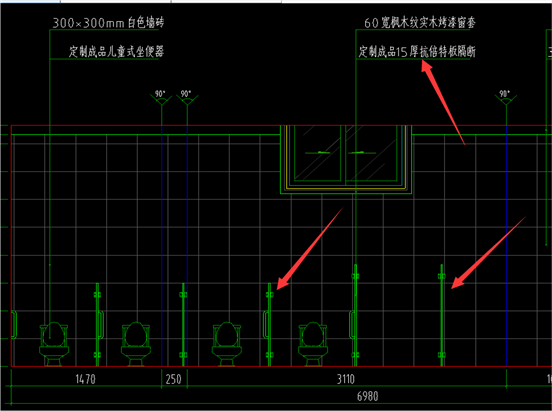 答:大便器隔断高度1800mm,小便器隔断300*600mm,均为15mm抗倍特板隔断。