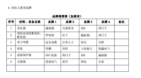 答:高低压成套配电柜,配电箱推荐的品牌“罗格朗”及“松下”改为“ABB”; 变压器推荐品牌中删除“天威保变”。