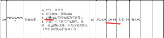 回复:合肥师范学院-室外附属工程金丝桃规格为25株/m2,投标人按照25株/m2自主报价,清单不调整。如下表,合肥师范学院-室外附属工程此项栽植色带综合单价由103.91元/m2调整为106.65元/m2。