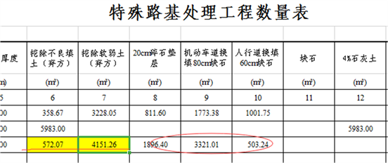 1、特殊路基处理工程数量表中该段挖方量与换填量不对应。