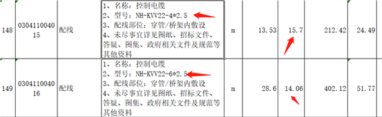 (3)NH-KVV22-6*2.5调整后的综合单价为22.07元/米,该部分对总价影响很小,最高投标限价不调整;投标人综合考虑报价,中标后不予调整。