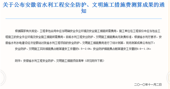 2)、三、编制依据7、安全防护、文明施工措施费用参照二〇一〇年十一月二日安徽省水利厅《关于公布安徽省水利工程安全防护、文明施工措施费用测算成果的通知》计取。本通知是针对概算建安工程取费的,投标是采用预算定额,内容为施工安全措施费,如何记取,请明确。