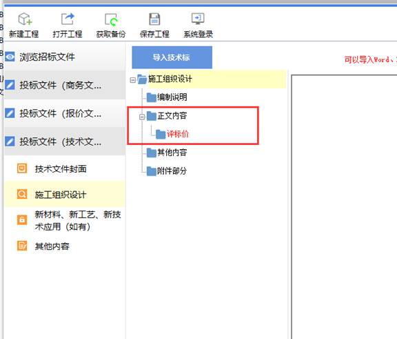 本项目投标制作工具中施工组织设计正文内容下的 “评标价”,请投标人忽略。施工组织设计正文内容应按照招标文件规定的施工组织设计内容放入相应的材料供评标委员会评审,切勿将报价文件放入施工组织设计中,以免造成废标。