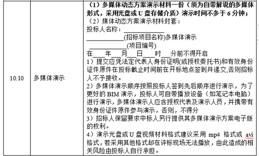 (1)多媒体动态方案演示材料一份(须为自带解说的多媒体形式,采用光盘或U盘存储介质)演示时间不多于6分钟; (2)媒体动态方案演示材料封套: 投标人名称: (招标项目名称)多媒体演示 (招标项目编号) 在 年 月 日 时 分前不得开启 1)投标人应凭法定代表人身份证明(或授权委托书)和有效身份证件原件在投标截止时间前在开标地点签到并递交多媒体动态方案演示材料,否则招标人不予接收。 2)演示光盘或U盘视频材料格式建议采用 mp4 格式或 avi 格式,若采用其他格式却在评标现场无法播放,由此造成的相关风险由投标人自行承担。 3)多媒体演示顺序按照投标人签到先后顺序进行演示,多媒体演示在评标室进行演示播放。若在评标现场无法播放,可允许投标人自带播放设备(如笔记本电脑)进行演示,演示的文件必须是投标人在现场递交的演示材料。进入评标现场的多媒体演示人应携带有效身份证件原件和授权委托书参与演示,否则此项不得分。 4)招标人保留要求中标人另行提供其多媒体演示方案电子版的权利。 5) 多媒体演示材料需在开标截止时间前在规定地点提交,若投标人未提交或演示材料无法读取,则该项不得分。 |
