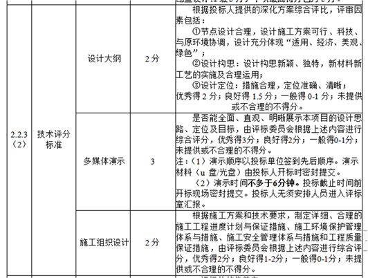 是否能全面、直观、明晰展示本项目的设计思路、定位及目标,由评标委员会根据上述内容进行综合评分,优秀得3分;良好得2分;一般得0-1分;未提供或不合理的不得分。 注:(1)多媒体演示顺序以招标文件第二章前附表须知10.10多媒体演示要求进行。演示材料(u 盘/光盘)由投标人开标时密封提交。 (2)演示时间不多于6分钟。投标截止时间前开标现场密封提交。 |