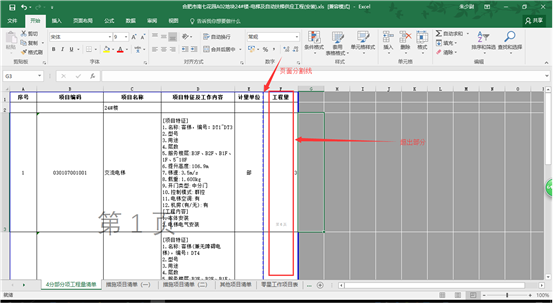 1、导入EXCEL已标价工程量清单时,请保持表格内的宽度不超过一页。超过一页部分会被切割开,并自动附到文档最后,造成内容不连贯(也可以通过打印预览查看是宽度是否超过一页)。如图所示: