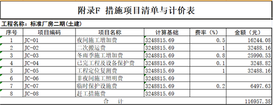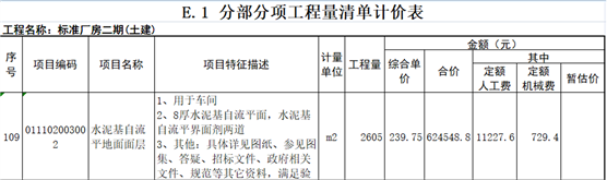 1、标准厂房二期(土建)单位工程工程量清单第109项 “水泥基自流平地面面层”(项目编码:011102003002),综合单价由44.12元/平方米调整为239.75元/平方米,;第113项 “水泥基自流平地面面层”(项目编码: 011102003006),综合单价由44.12元/平方米调整为239.75元/平方米;第120项 “外墙墙面”(项目编码:WB011406001001),综合单价由151.72元/平方米调整为194.6元/平方米;最高限价表格调整如下:(1)调整后分部分项工程量清单计价表如下: