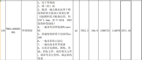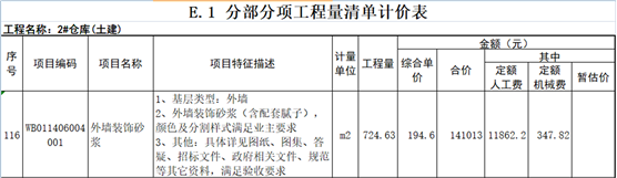 3、2#仓库(土建)单位工程工程量清单第116项 “外墙装饰砂浆”(项目编码:WB011406004001),综合单价由151.72元/平方米调整为194.6元/平方米;最高限价表格调整如下: