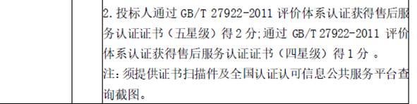 3、招标文件P49页详细评审标准中2.2.3(1)条款要求“投标人通过GB/T27922-2011评价体系认证获得售后服务认证证书(五星级)得2分。通过GB/T27922-2011评价体系认证获得售后服务证证证书(四星级)得1分。注:需提供证书扫描件及全国认证认可信息公代服务平台查询截图。”经了解此认证证书是按照《商品售后服务评价体系》标准(GB/T27922-2011)对企业的服务能力进行审核评价认证,本项目为建设项目。请问此项评分是否可以取消?