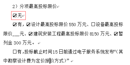 ☑有,☑设计最高投标限价550万元、□设备最高投标限价___元、☑建筑安装工程最高投标限价8150万元、☑暂列金300万元。