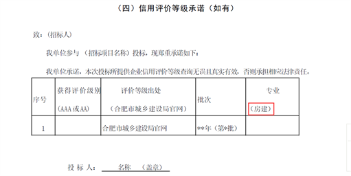 答:投标文件格式中的信用评价等级承诺仅为模板,请投标人根据招标文件要求自行调整专业类型。
