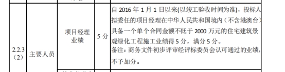 答:若投标人提供:自2016年1月1日以来(以竣工验收时间为准),投标人拟委任的项目经理在中华人民共和国境内(不含港澳台)具备一个住宅建筑室外附属工程施工业绩,且此业绩中包含不少于2000万元的景观绿化工程施工内容。予以加分。提供的证明资料详见投标人须知前附表附录5中规定提供的业绩证明材料。