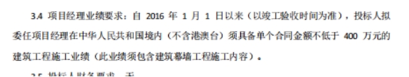 答:若投标人提供自 2016 年 1 月 1 日以来(以竣工验收时间为准),拟委任项目经理在中华人民共和国境内(不含港澳台)具备单个合同金额不低于400万元的幕墙工程施工业绩,予以认可。