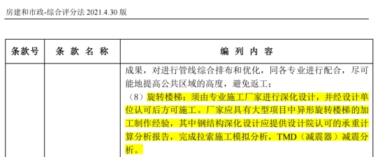 1、第二章投标人须知3.7.1施工组织设计编制的特殊要求中第(8)条旋转楼梯:须由专业施工厂家进行深化设计,并经设计单位认可后方可施工。厂家应具有大型项目中异形旋转楼梯的加工制作经验,其中钢结构深化设计应提供设计院认可的承重计算分析报告,完成拉索施工模拟分析,TMD(减震器)减震分析。