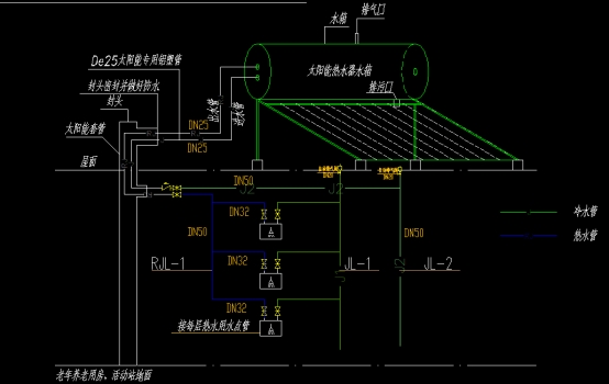 3、屋顶太阳能系统,JL-2和RJL-1为标明管径,及RJL-1一至三层顶立管未见其系统图,请设计明确?