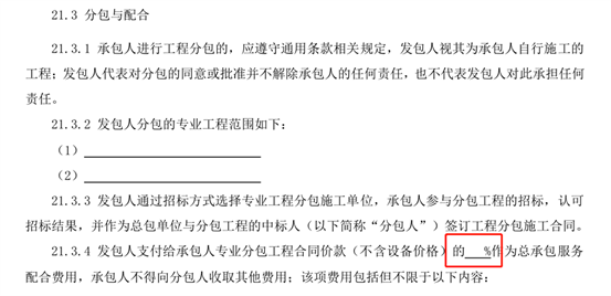 4、招标文件补充条款中未明确发包人支付给承包人专业分包总承包服务配合费的取费费率,请明确。