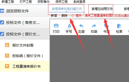 (1)上图中红框处新增总说明文件中导入报价文件(包含:投标函、工程量清单报价书)。