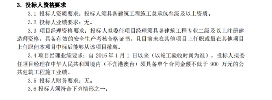 3.4 项目经理业绩要求:自 2016 年 1 月 1 日以来(以竣工验收时间为准),投标人拟委任项目经理在中华人民共和国境内(不含港澳台)须具备单个合同金额不低于 900万元的公共建筑工程施工业绩。