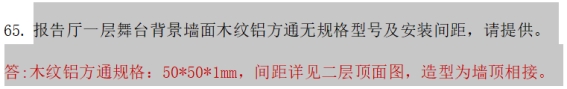 6、主教学楼报告厅一装饰清单10项特征描述中及图纸中无50*50*1mm木纹铝方通间距?请明确。