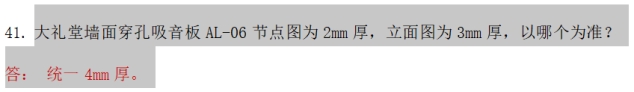 5、艺术楼三层装饰清单119项特征描述为4厚穿孔铝板,表面木皮色开孔率26%,背衬无纺布(AL-06,凹凸造型)与三层(大礼堂)墙身饰面图(图号3.2.P05)标注为3mm厚穿孔金属吸音板以和大礼堂节点图中(图号2.2.D01)05节点标注为2厚穿孔铝板,表面木皮色开孔率26%,背衬无纺布不一致,是否以清单为准?请明确。