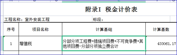 6、控制价的室外安装工程的税金计价表中的增值税的计算基础中有“-分部分项独立费合计”,而招字接收进来的软件版中的对应部分没有该部分,请问软件中税金的计算基础中是否也要“-分部分项独立费合计”?