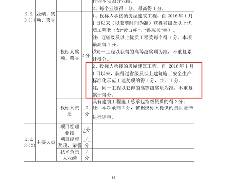 3、问:招标文件P67页详细评审标准中2.2.3投标人奖项、荣誉——第2条:投标人承接的房屋建筑工程,自 2016 年 1 月 1 日以来,获得过省级及以上建筑施工安全生产标准化示范工地奖项。请问:奖项、荣誉以行政主管部门或在国内依法登记注册的行业协会(或学会)颁发的奖项等同于建筑施工安全生产标准化示范工地,是否认可,请明确。