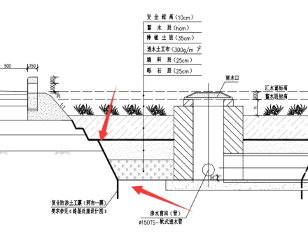 答复:下沉式绿带侧复合防渗土工膜高度按展开1.2m考虑。