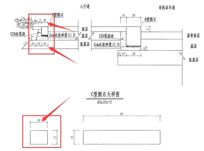 2.2道路工程:设计图纸施工范围内车行道、非机动车道、人行道、侧石等附属工程所有内容。车行道及非机动车道为沥青混凝土面层,人行道为6cm花岗岩面层。