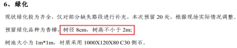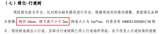 6.1设计总说明绿化行道树胸径10cm,树叉高不小于2m;路基、路面设计说明绿化行道树胸径8cm,树叉高不小于2m。(1)胸径二处不一致,以哪个为准?(2)香樟高度及冠幅如何考虑?