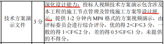 深化设计能力:投标人视频技术方案演示包含涉及本工程的施工节点管理及管线施工方案等设计展示,提供 1-2 分钟内 MP4 格式的方案视频演示,由评标委员会进行综合评分,优的得2<F≤3 分,一般的得 1<F≤2 分,差的得 0.5≤F≤1 分,未提供的不得分。