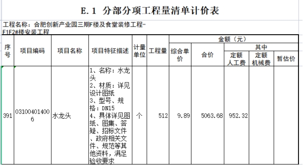 4、合肥创新产业园三期F楼及食堂装修工程-F1F2#楼安装工程单位工程,新增清单第391项,具体如下,投标人根据本补疑自行新增工程量清单: