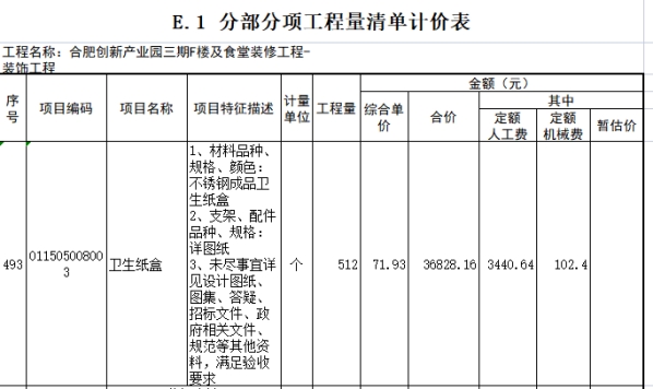 合肥创新产业园三期F楼及食堂装修工程-装饰工程单位工程,新增清单第493项,具体如下,投标人根据本补疑自行新增工程量清单:
