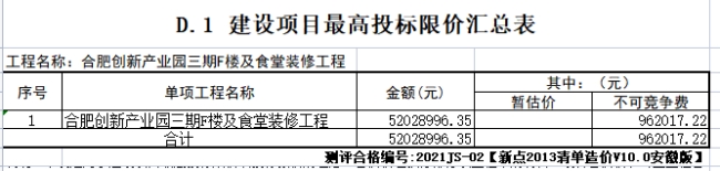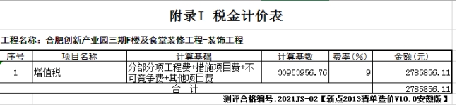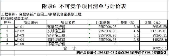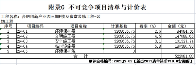 5、调整后的合肥创新产业园三期F楼及食堂装修工程-装饰工程 “单位工程最高投标限价汇总表”、“措施项目清单与计价表”、“不可竞争项目清单与计价表”、“税金计价表”如下:
