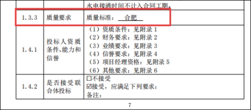 3.招标文件P7页(如下图1所示),投标人须知前附表中1.3.3质量要求,质量标准:合肥,是否与招标文件P169页第七章 技术标准和要求中对工程质量要求保持一致?