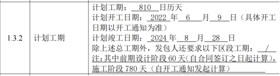 (2)计划开工日期为2022年6月9日,计划竣工日期为2024年8月28日,间隔811天,实际为812日历天;