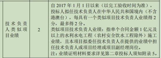 并且评分标准表2.2.2(4)对于技术负责人业绩的认定标准为“类似项目技术负责人业绩:指单个合同金额 1 亿元及以上的水利水电工程(农村安全饮水工程除外)施工业绩,且本项目拟委任技术负责人在提供的业绩中担任技术负责人或项目经理或项目副经理岗位。”