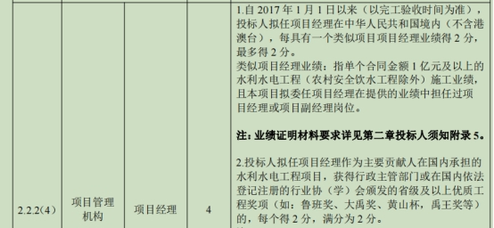 评分标准表2.2.2(4)项,类似项目经理业绩:指单个合同金额 1 亿元及以上的水利水电工程(农村安全饮水工程除外)施工业绩,且本项目拟委任项目经理在提供的业绩中担任过项目经理或项目副经理岗位。