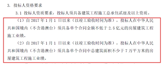 1)自2017年1月1 日以来(以竣工验收时间为准),投标人在中华人民共和国境内(不含港澳台)须具备单个合同金额不低于2.5亿元的房屋建筑工程施工业绩。