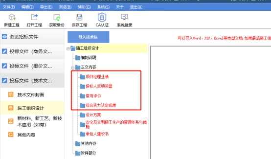 7.查阅本项目技术文件上传界面,施工组织设计正文内容中包含多个章节内容(如下图所示)。