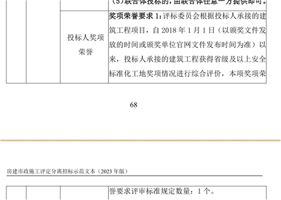 7. 招标文件P68页详细评审标准投标人奖项荣誉奖项荣誉要求 1:评标委员会根据投标人承接的建 筑工程项目,自 2018 年 1 月 1 日(以颁奖文件发 放的时间或颁奖单位官网文件发布时间为准)以 来,投标人承接的建筑工程获得省级及以上安全 标准化工地奖项情况进行综合评价,本项奖项荣誉要求评审标准规定数量:1 个。