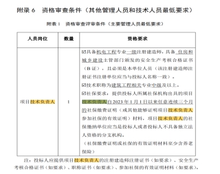 注:投标人应提供项目技术负责人的注册建造师注册证书(如要求)、安全生产考核合格证书(如要求)、职称证书(如要求)、参加社保的有效证明材料(如要求)。