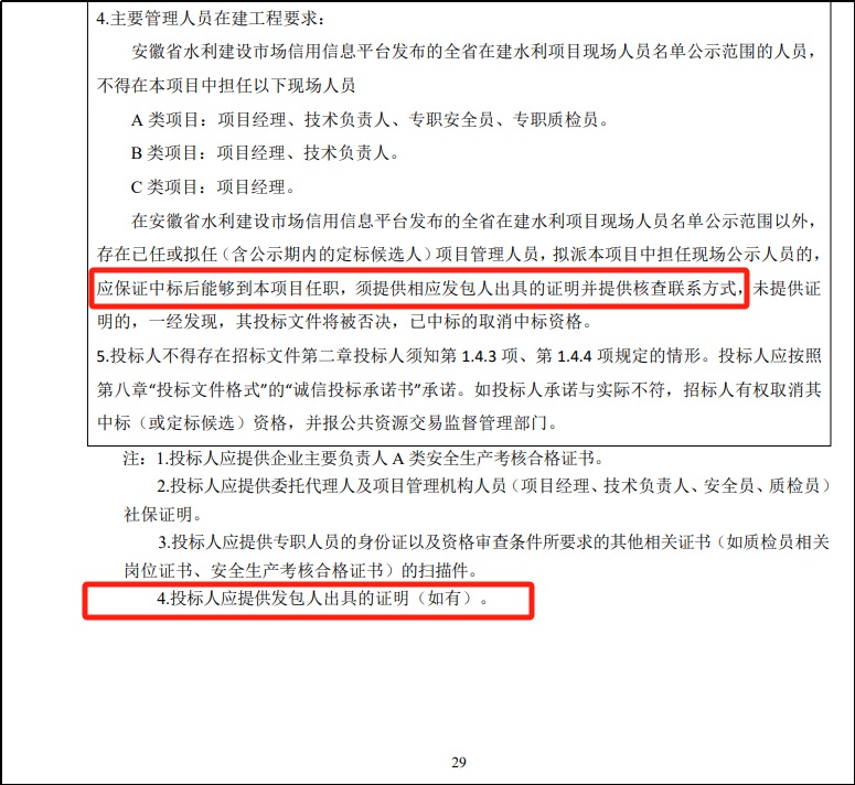 答:(1)投标人任用人员在安徽省水利建设市场信用信息平台发布的全省在建水利项目现场人员名单公示范围以外,存在已任或拟任 (含公示期内的定标候选人) 项目管理人员,拟派本项目中担任现场公示人员的须提供相应发包人出具的证明并提供核查联系方式;(2)投标人须在投标文件中提供该证明;(3)无具体的证明格式要求。
