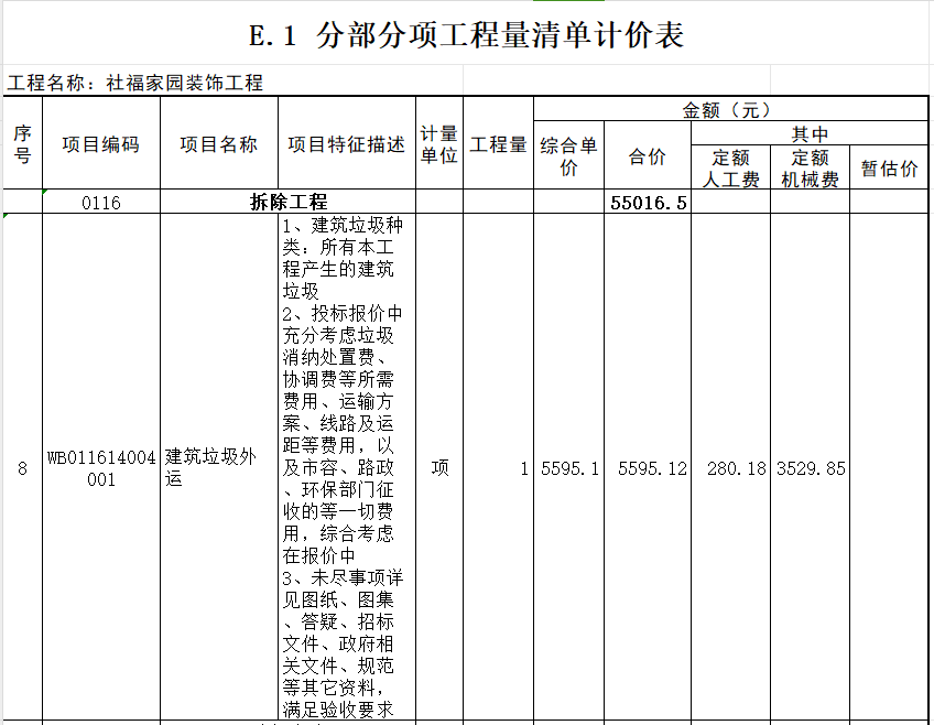 28.疑问事项:社福家园装饰工程第8条建筑垃圾外运,综合单价为476.74元/项,单价偏低,请复核。
